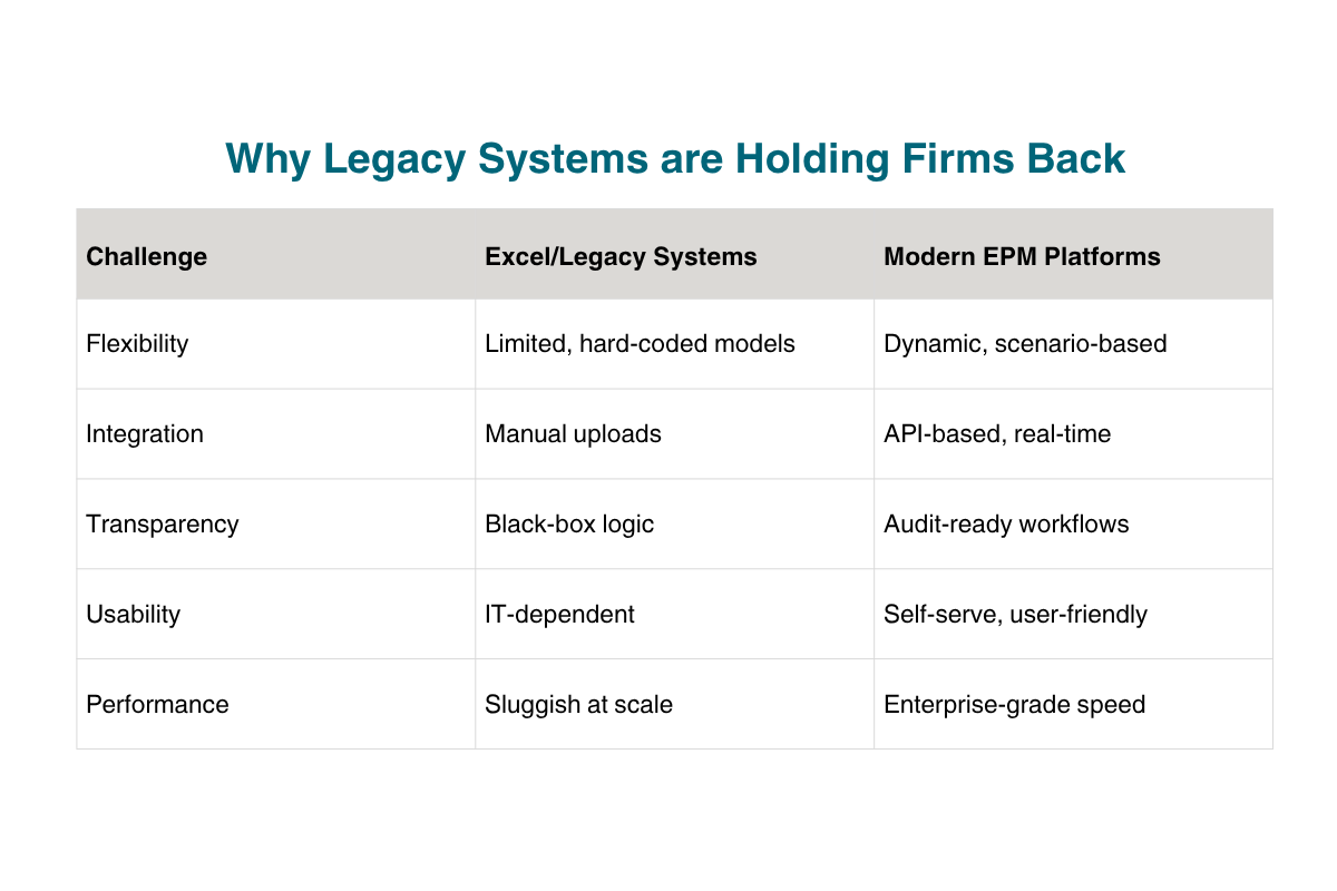Legacy systems often hinder more than they help. They’re prone to errors, hard to maintain, and struggle with transparency. Planning becomes reactive, fragmented, and inefficient. Modern EPM platforms solve these challenges – not just with technology, but by fundamentally shifting how organisations collaborate and decide.