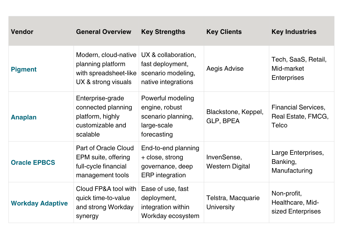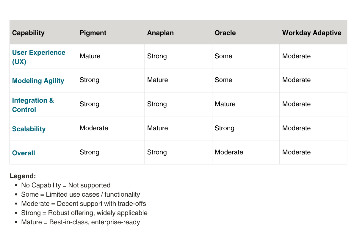 To thrive in today’s dynamic business landscape, organisations need EPM platforms that are agile, intelligent, and future-ready. The five key capabilities are no longer optional but essential. The table below highlights leading EPM vendors that excel in delivering these capabilities, helping businesses stay ahead of the curve.