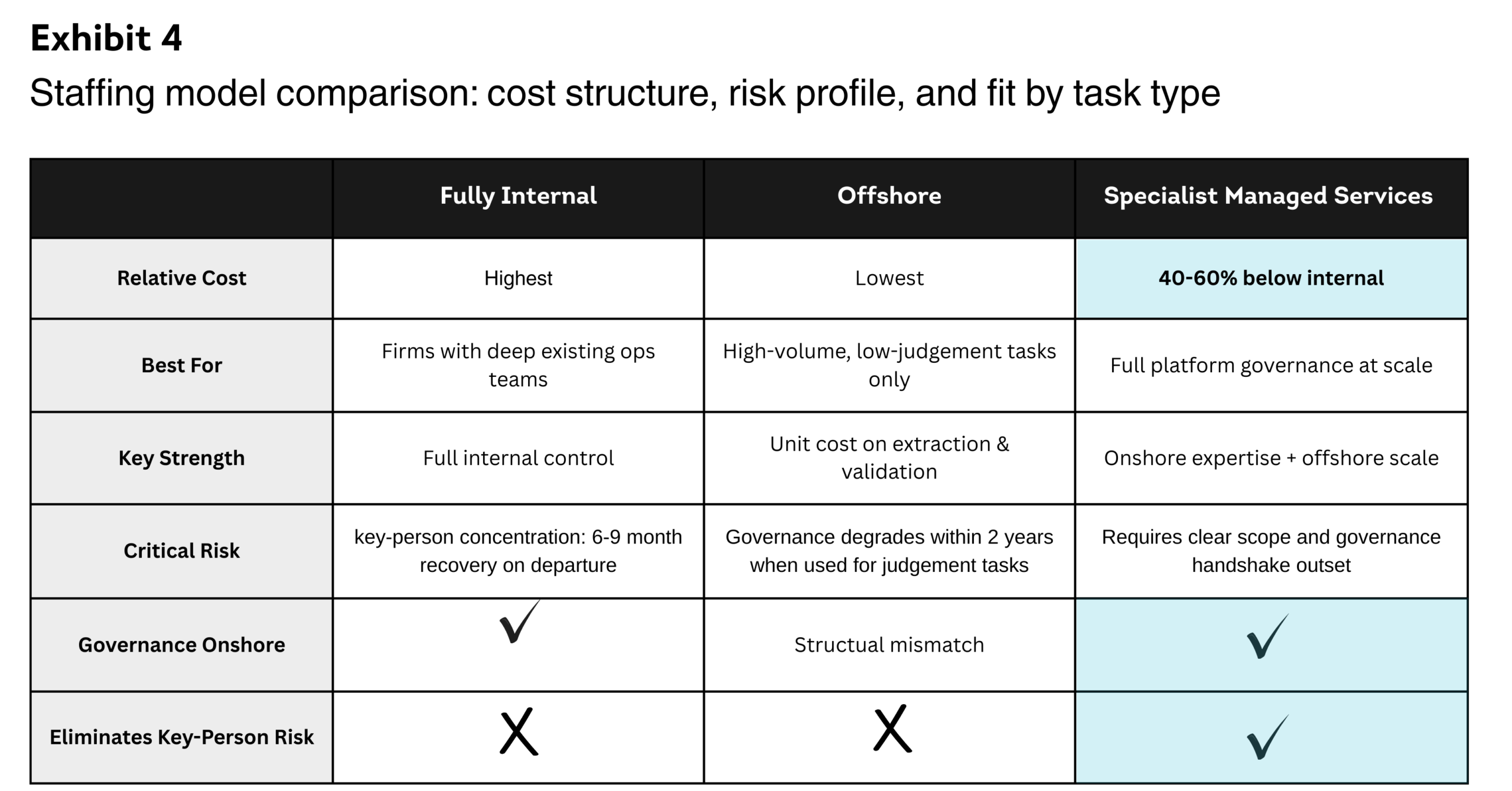 - Governance, escalation, and configuration management must be held onshore, close to the investment team. Volume tasks can scale offshore. Conflating the two consistently causes governance to degrade within two years.
