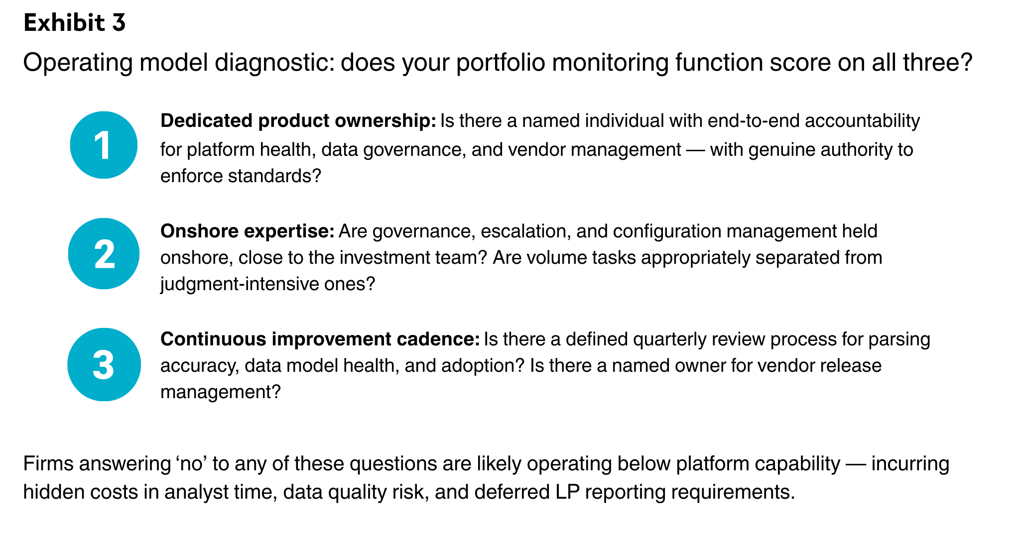 The firms operating at top-quartile platform utilization treat their portfolio monitoring configuration as a product under active development, not an installation that is complete. They run quarterly reviews of parsing accuracy, with recalibration triggered whenever exception rates exceed a defined threshold. They operate structured change management for data model updates, with governance committee review and documented impact assessments.