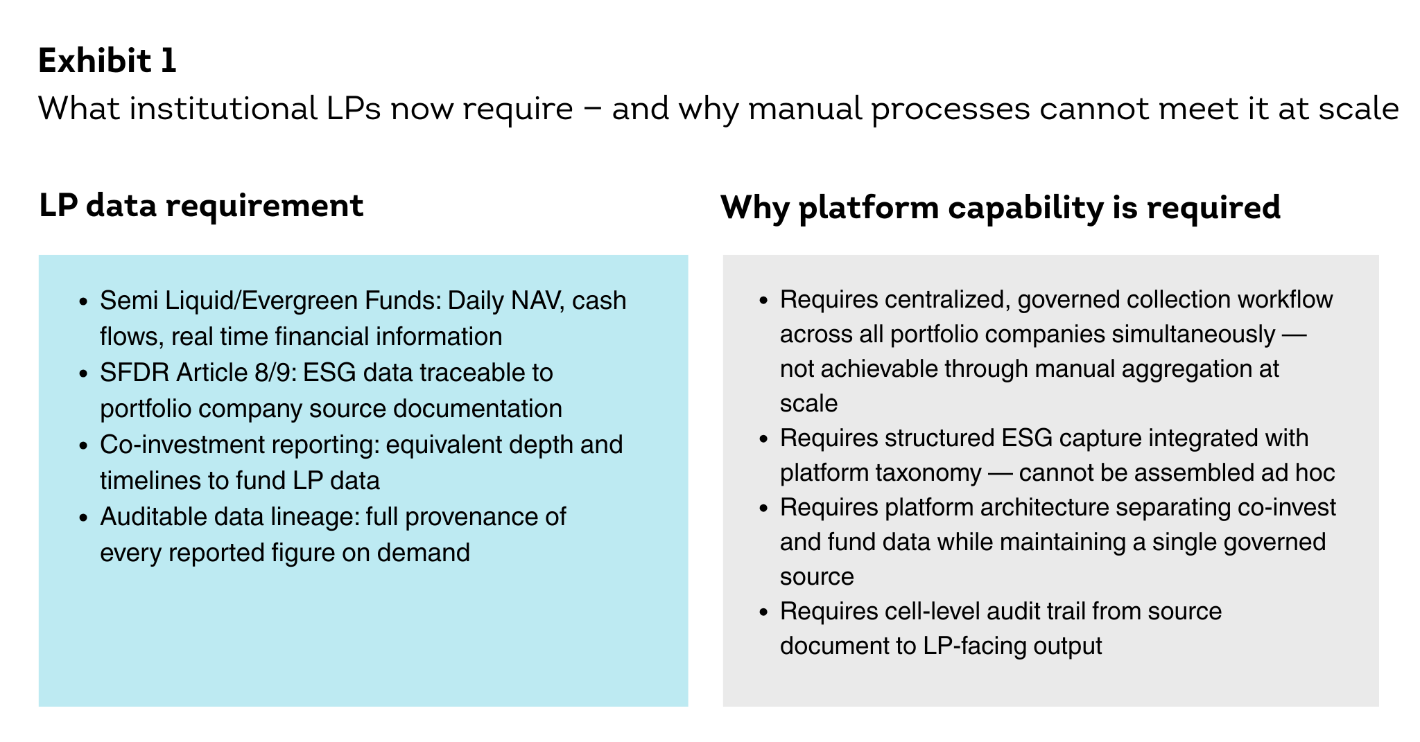 - Four structural forces: AUM scale, LP data requirements (ILPA, SFDR), Semi Liquid/Evergreen funds and co-investment obligations, have made platform capability a precondition for raising capital, not merely an efficiency tool.