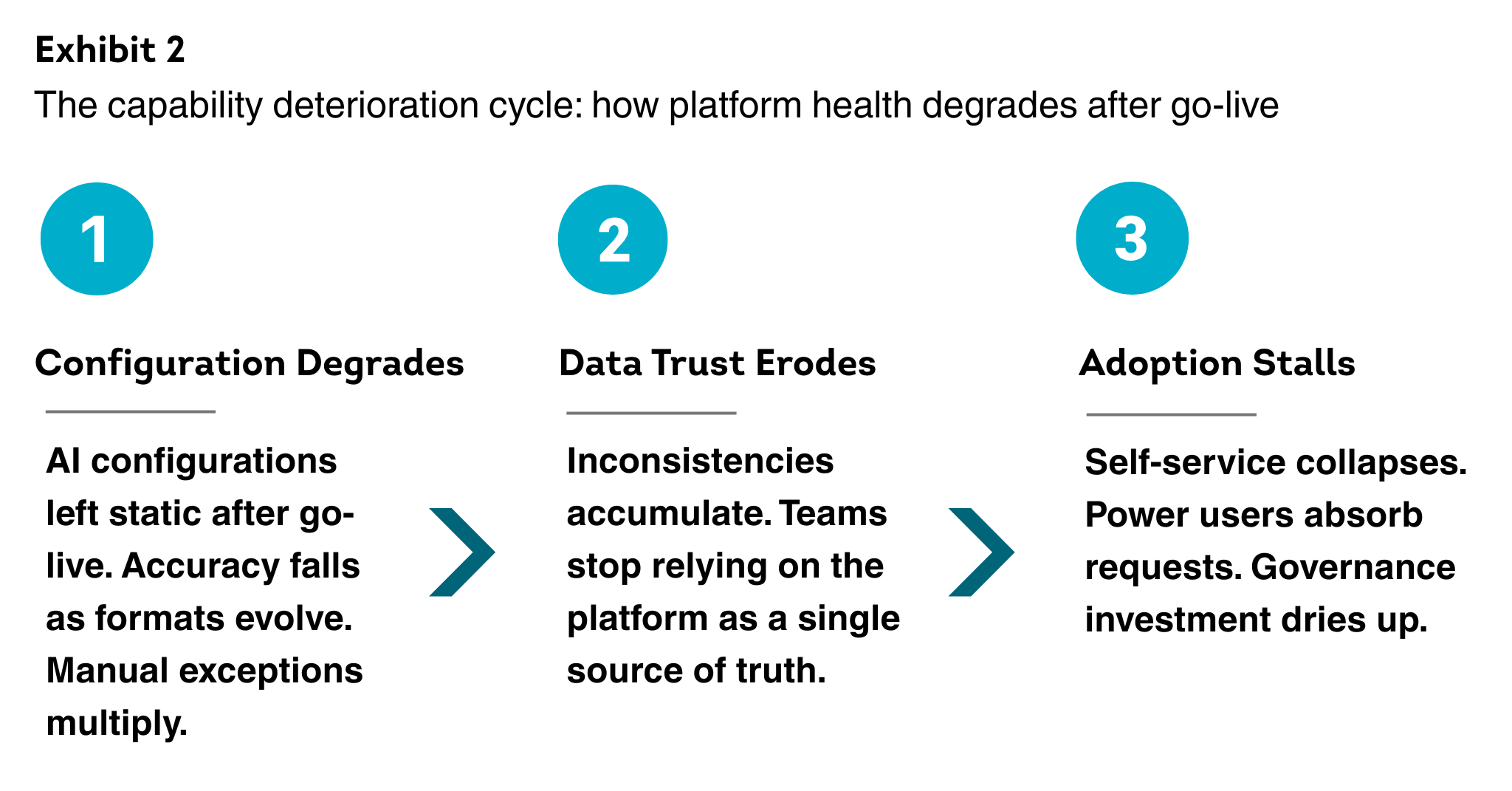 - Platforms fail silently through a three-stage cycle: static AI parsing configurations degrade, ungoverned data models lose consistency, and adoption stalls outside the core operations team.